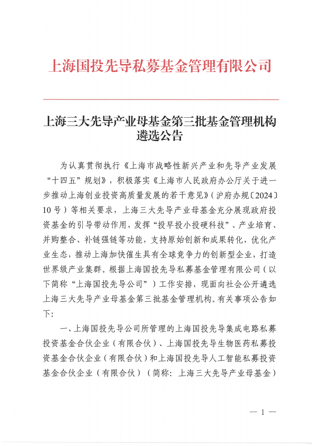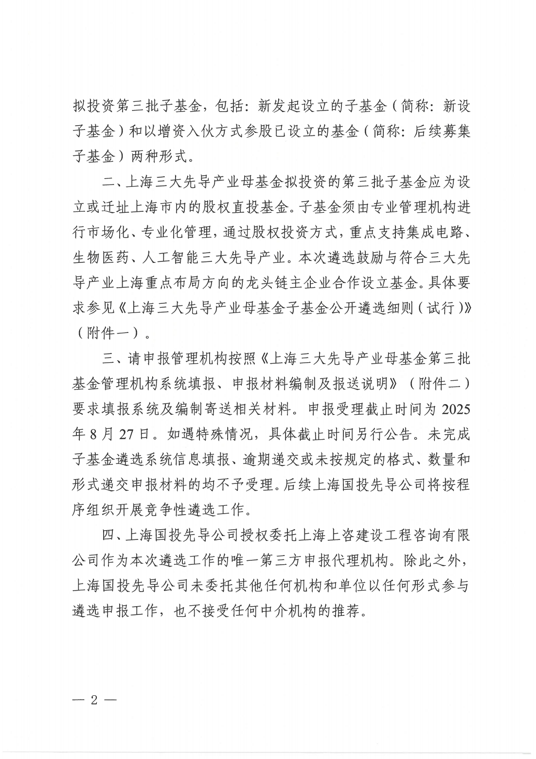 上海三大先导产业母基金第三批基金管理机构遴选公告