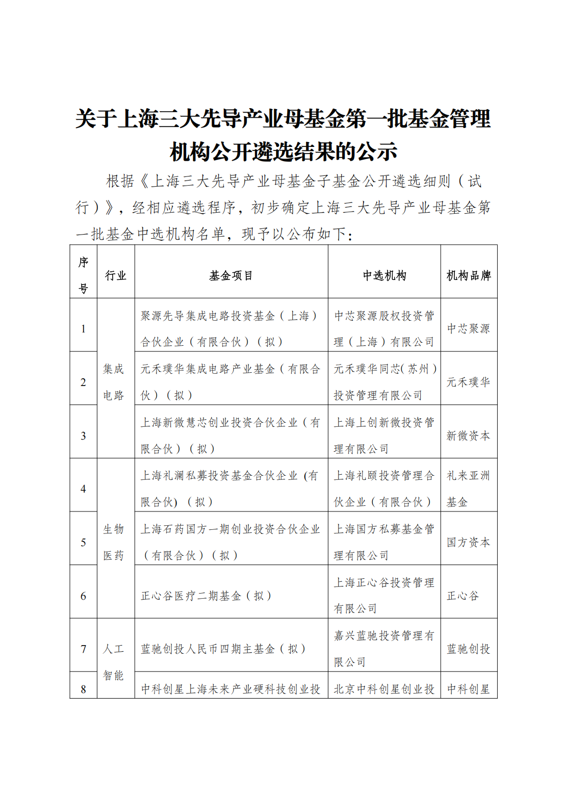 关于上海三大先导产业母基金第一批基金管理机构公开遴选结果的公示